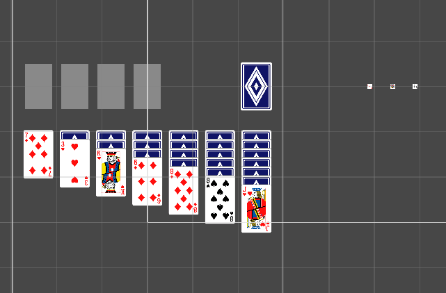 Deck(우측 상단 남은 카드)을 클릭했을 때 카드가 3개 나와야 하는데, 나오지 않아 씬을 살펴보니 게임 화면 밖에 카드가 작게 생성된 것을 확인할 수 있었어요 (쪼꼬미들 안보여 ,..)